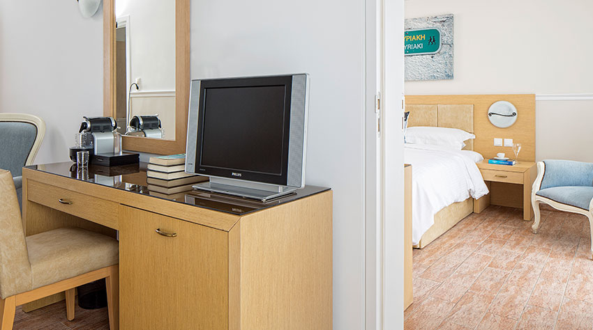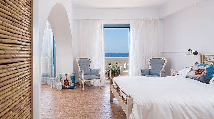 In our hotel you will find Double Rooms, Double Rooms with side Sea View, Superior Rooms, our beautiful Ariadni Room with sea view, the Sea View Suite and two Family Rooms.